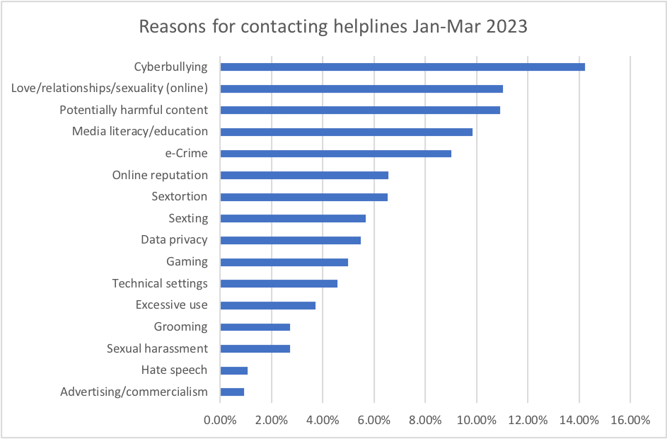 Figure 1: Reasons for contacting helplines January-February 2023 (Better Internet for Kids)