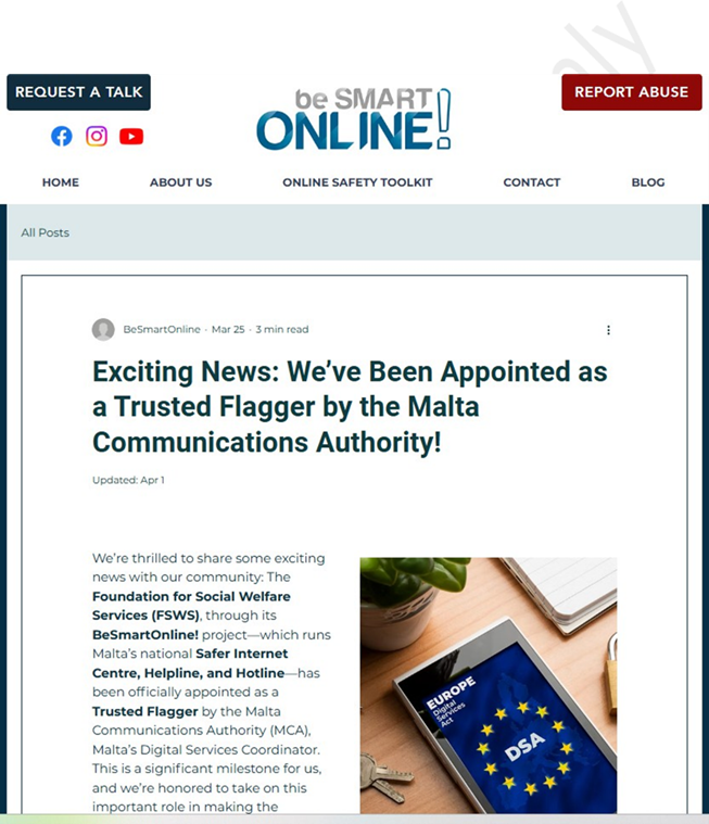 Press release announcing the Maltese SIC's designation as a trusted flagger - The SIC has integrated discussions on the trusted flagger role within its Wise use of technology sessions, ensuring professionals and parents understand the significance of the DSA and its impact.